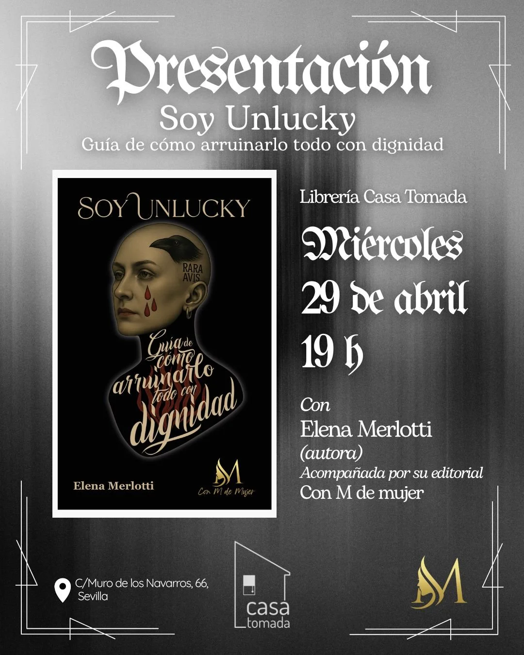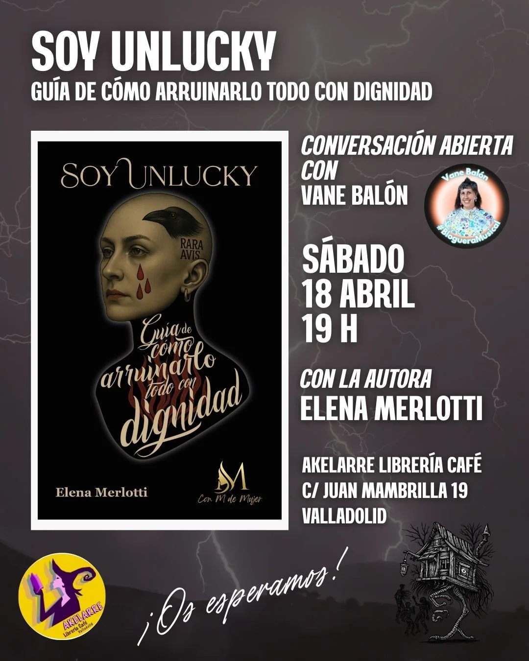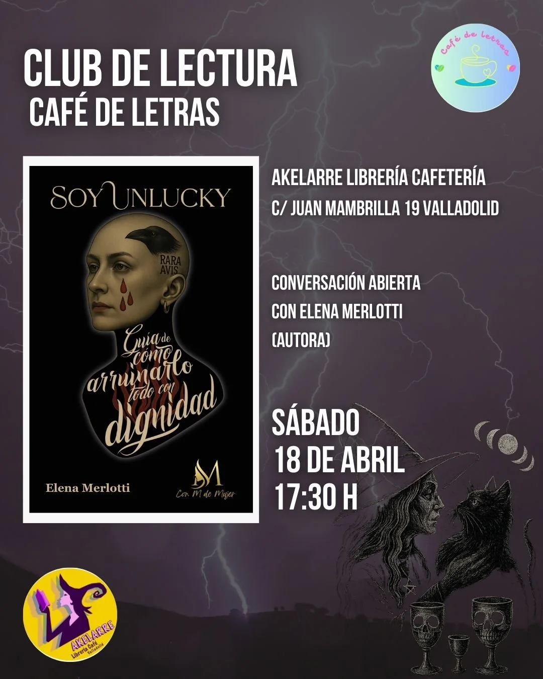 Aquí El próximo 18 de abril, Elena Merlotti se encuentra con el club de lectura Café de Letras en Valladolid para compartir una conversación abierta en torno a Soy Unlucky. Guía de cómo arruinarlo todo con dignidad.