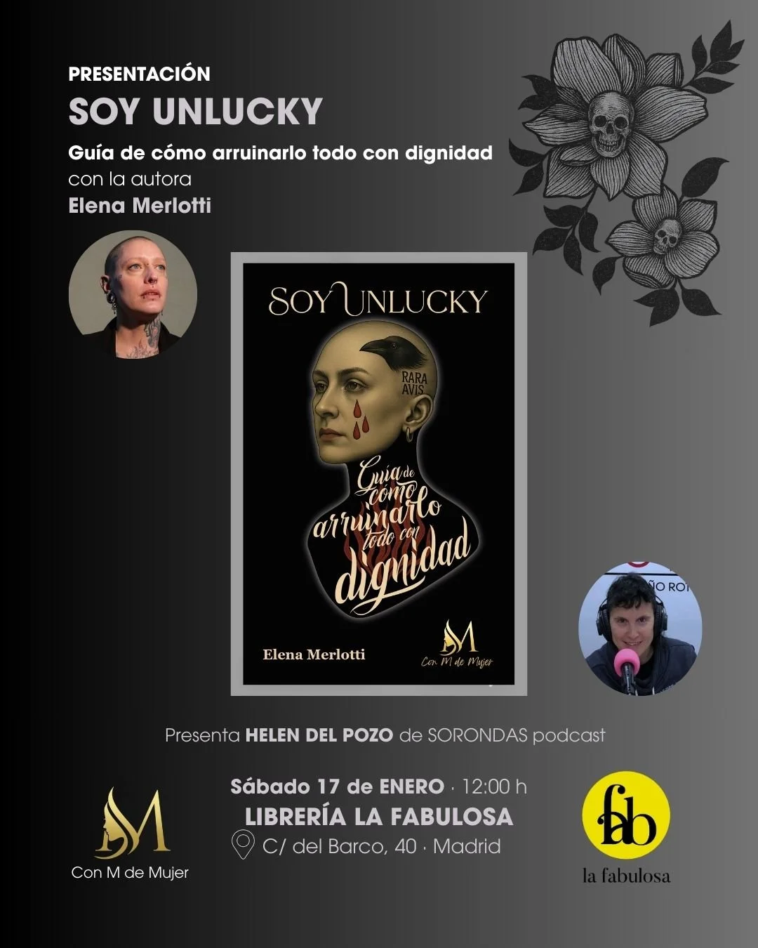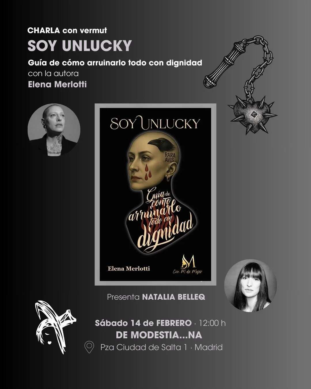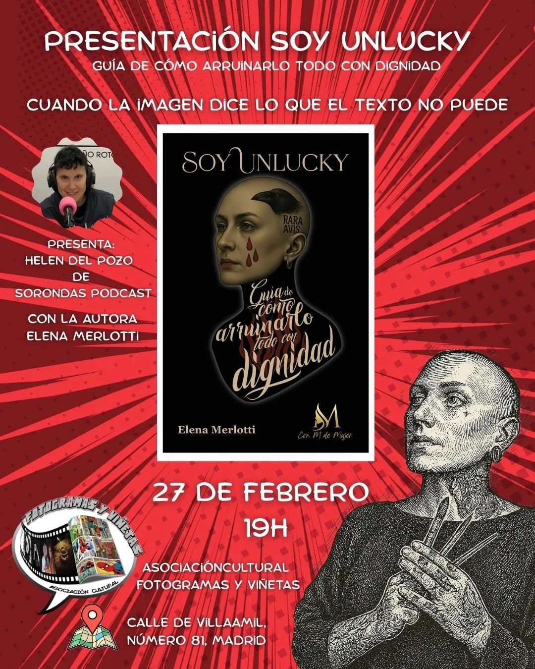 Aquí El próximo 18 de abril, Elena Merlotti se encuentra con el club de lectura Café de Letras en Valladolid para compartir una conversación abierta en torno a Soy Unlucky. Guía de cómo arruinarlo todo con dignidad.