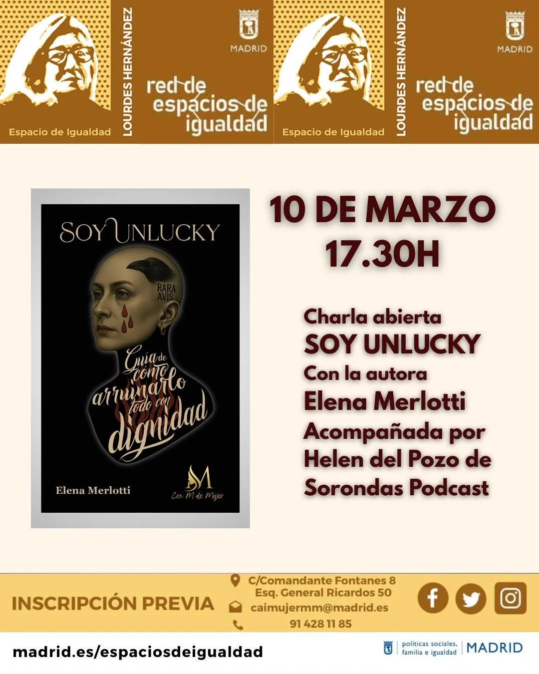 El 10 de marzo, el Espacio de Igualdad Lourdes Hernández (Carabanchel) acoge una charla en torno a Soy Unlucky. Guía de cómo arruinarlo todo con dignidad, de Elena Merlotti.