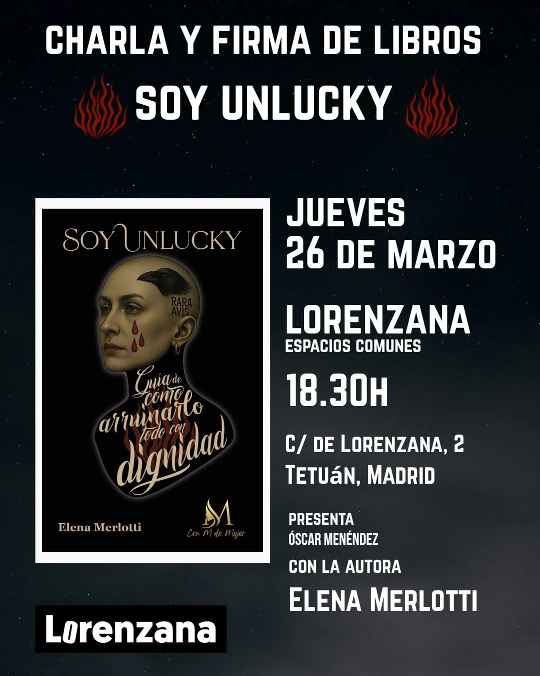 El próximo 26 de marzo, Espacios Comunes Lorenzana acoge la presentación de Soy Unlucky. Guía de cómo arruinarlo todo con dignidad, de Elena Merlotti.